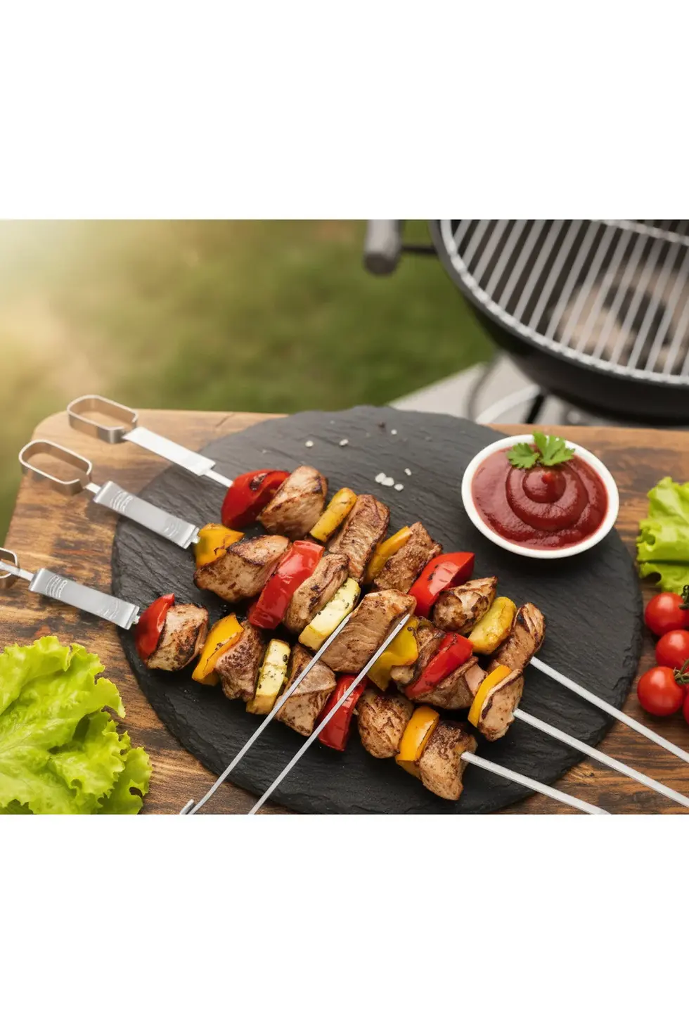 El Korumalı Maşalı Izgara Mangal Şişi - Paslanmaz Çelik Et İtme Mekanizmalı Şiş